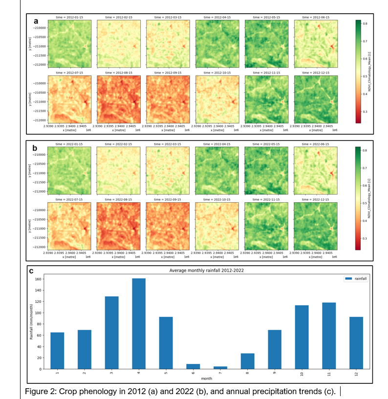 From a geospatial analysis perspective, the Normalized Difference Vegetation Index (NDVI) was selected as an indicator of crop health, which was derived from Landsat images that are freely accessible via the DE Africa platforms. These were combined with climate data to understand the effect of climatic factors on crop health and phenology in the Rwimbogo sector in the drought-prone Eastern Province of Rwanda.