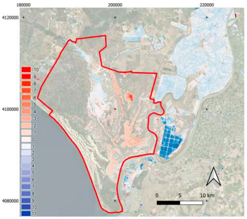 Theil–Sen slope in days/year showing the hydroperiod trend from 1974 to 2021. Red indicates consistent and significant decreasing trend in hydroperiod, while blue indicates the opposite (methods from Díaz-Delgado et al. 2016). The boundary of Doñana National Park is shown in red