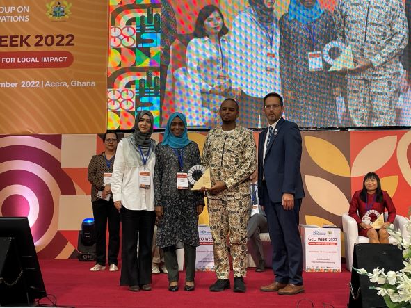 DE Africa's Dr Kenneth Mubea accepting the award on stage with Khairiya Masoud from The State University of Zanzibar At GEO Week 2022, Digital Earth (DE) Africa won a…07 Nov 2022