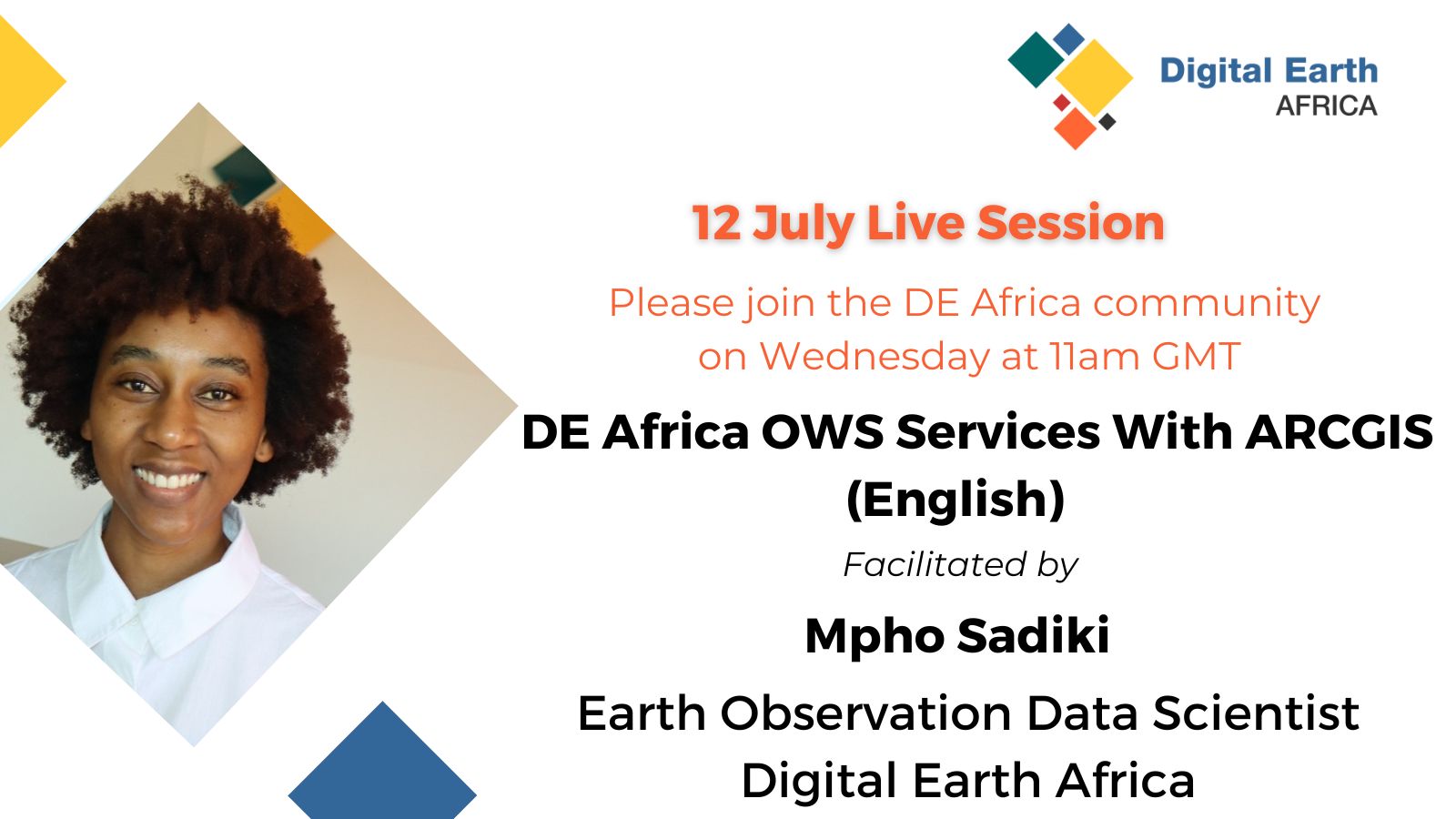 Please join the Digital Earth Africa community at 11 GMT as Mpho Sadiki, DE Africa Earth Observation Data Scientist, discusses DE Africa OWS Services with ARCGIS.