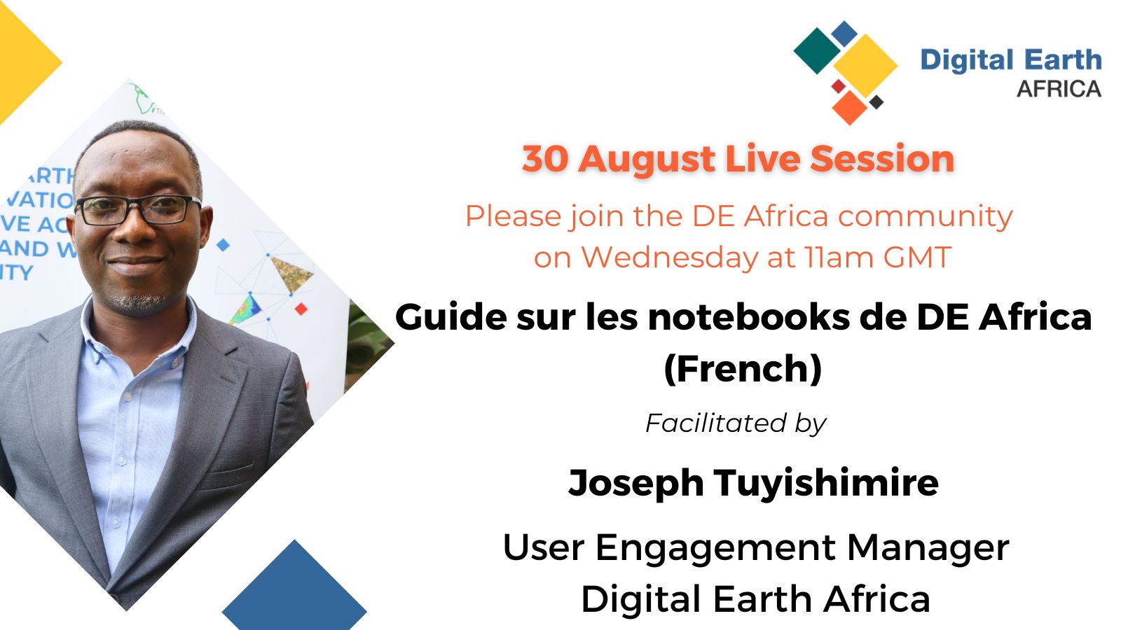 Please join the Digital Earth Africa community at 11am GMT, as Joseph Tuyishimire, DE Africa User Engagement Manager discusses Guide sur les notebooks de DE Africa.