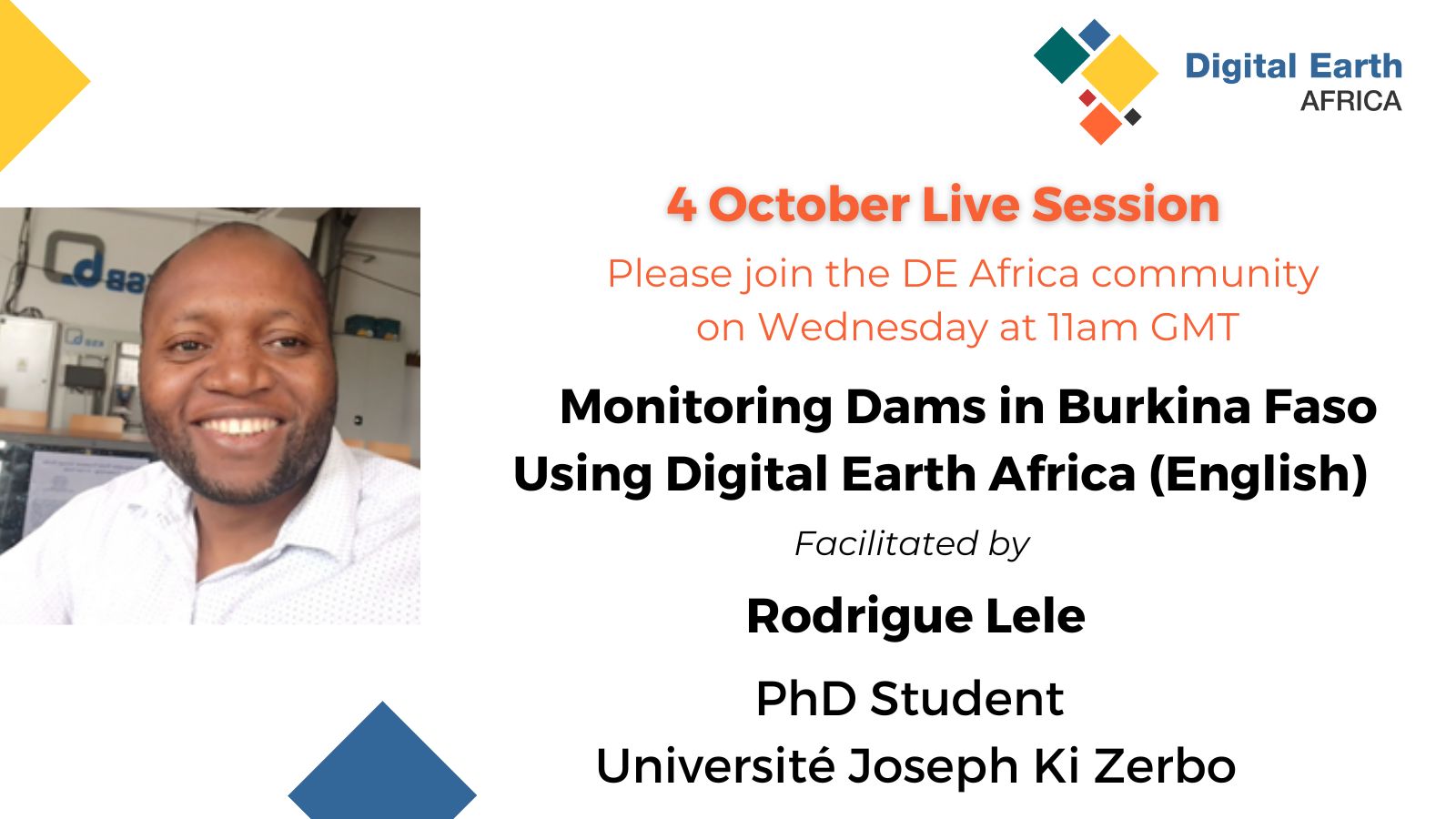 Please join the Digital Earth Africa community at 11am GMT as Rodrigue Lele, PhD Student discusses Monitoring Dams in Burkina Faso Using Digital Earth Africa.