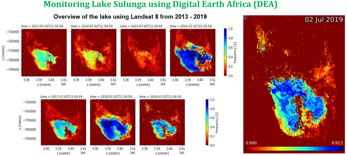 DE Africa worked with Mr Mugambi to transition the NBS to the new platform and conducted further analysis of Lake Sulunga using the Water Observations from Space (WOfS) available both in the DE Africa Map portal and DE Africa Sandbox interface for advanced analysis. This has allowed for time-series analysis over a six-year period from 2013 to 2019 to plot the minimum and maximum water extents. This type of analysis helps monitor the lake for variations in volume and depth to understand and plan for those times throughout the year. The insights gained are already helping the government improve policy and make informed decisions to contribute to SDGs.