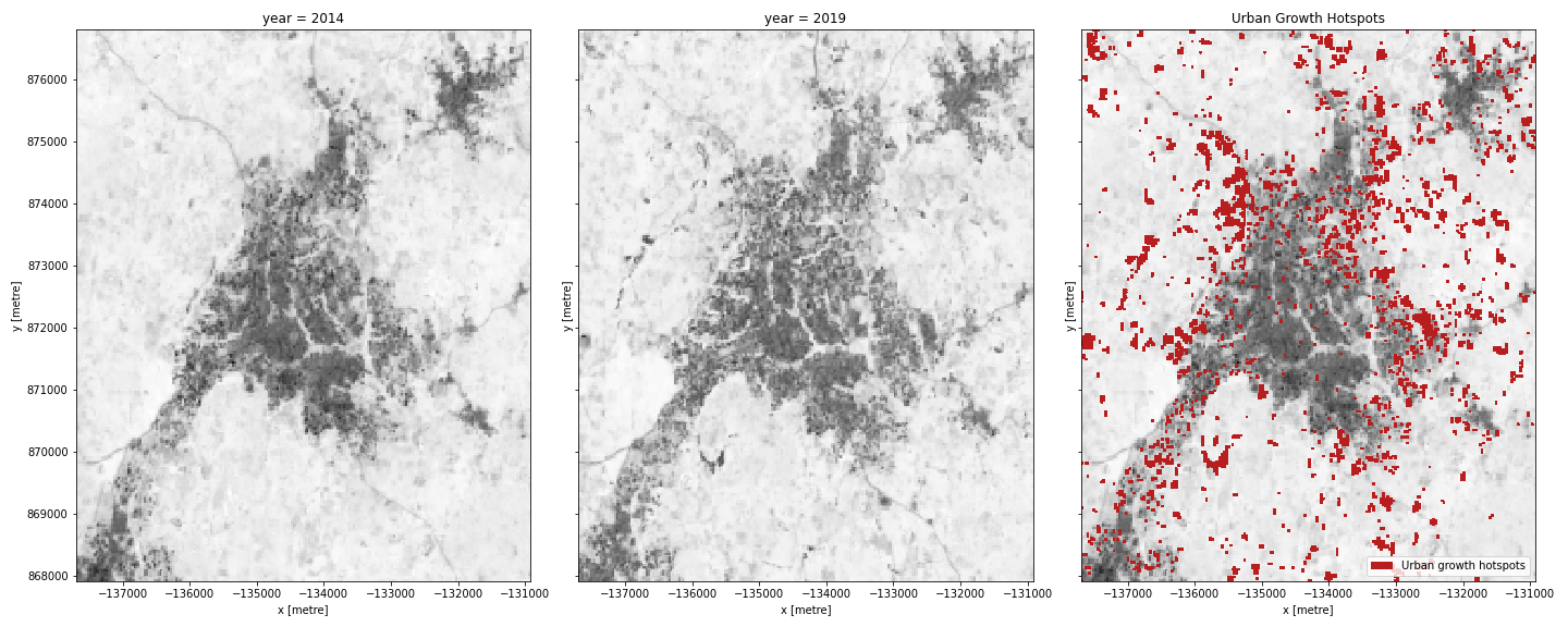 The Urban Extent Change Detection notebook is an analysis tool that monitors urban expansion in order to track urban development over time. Using Landsat 8 satellite imagery, the change in urban extent between a baseline period and a more recent period is estimated. The difference in urban extent (area is square kilometres) between the two periods is calculated, along with a map highlighting the locations of urban growth hotspots.