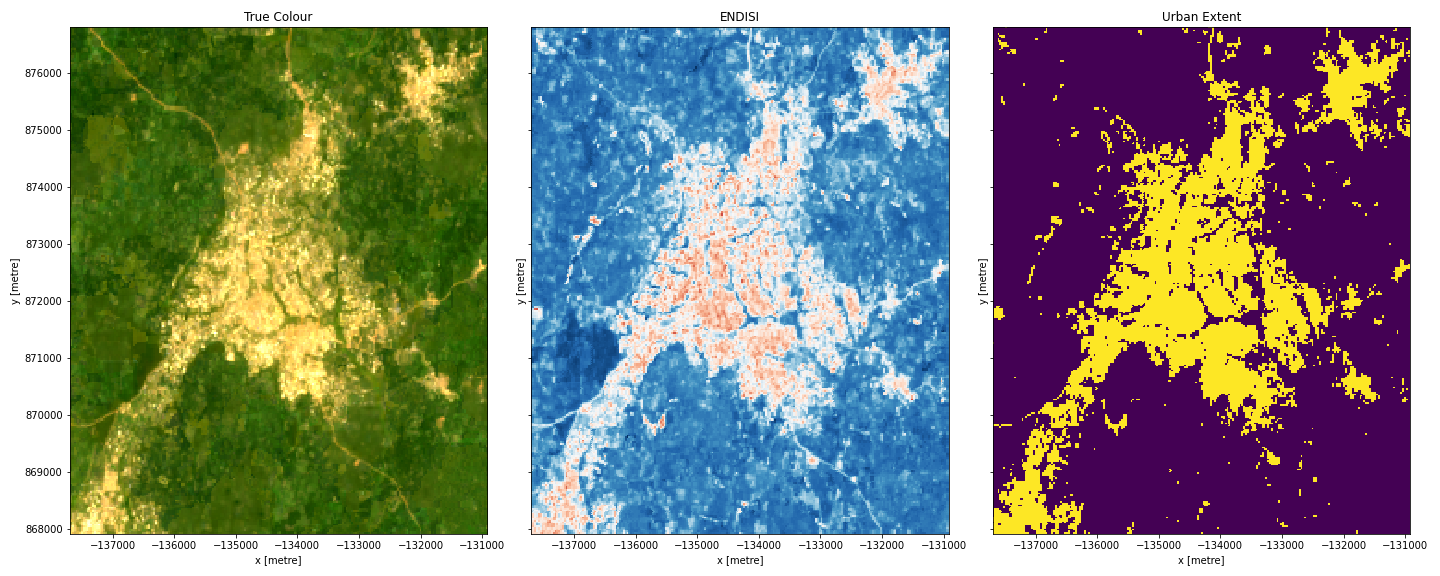 The Urban Index Comparison notebook is an analysis tool that demonstrates the use of multiple remote sensing measures of urban extent. In the remote sensing literature, there are many different urbanisation indices with different characteristics that are useful for different use cases. It can be useful to compare the performance of several indices for an area - determining which is the best for an area based on the outputs and a "ground truth" dataset of urbanisation.