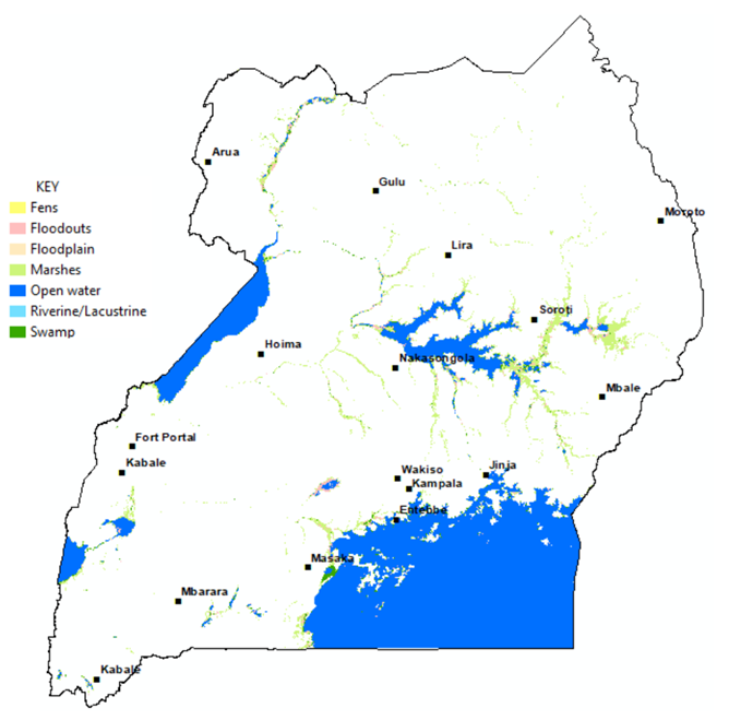 Key activities included the drafting of wetlands inventory maps for both Kenya and Uganda, utilising the Wetlands workflow notebooks available on the Digital Earth Africa Sandbox platform; the development of a data capture tool using the Esri ArcGIS Survey 123 field data collection application (which included detail such as wetland name, type by seasonality, descriptions and photographs, and community benefits); and stakeholder interviews (including the gathering of gender-related information and perspectives from both NEMA staff and community members). Draft inventory wetlands map, Uganda, below.