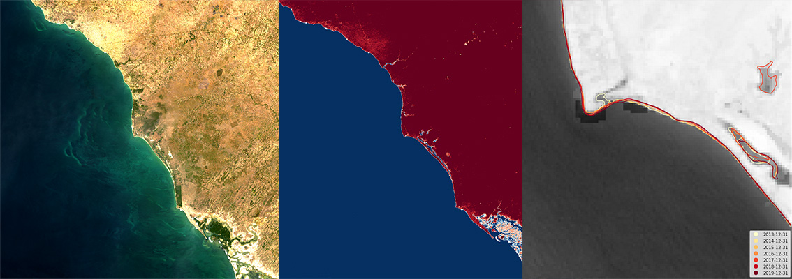 Coastlines available on the DE Africa platform, takes advantage of years of Landsat satellite data to compose extensive images of the African coastline. Conventional methods of monitoring coastline erosion are resource-intensive; field surveys are time-consuming and can be hazardous, aerial photography and LiDAR methods are expensive. Both require frequent revisits to build up a useful dataset. The DE Africa coastline mapping tool offers timely and cost-effective information tailored to land quality and coastline change monitoring. The tool is hosted on the Digital Earth Africa Sandbox, our freely accessible online analytics platform. The tool can be easily used to scope change over time, showing receding shores where erosion has been occurring. This provides insight to the severity of coastal erosion hotspots in an efficient and timely manner. The tool supports analysis of large areas of coast, that can be tailored to different areas around the continent. Coastal erosion contours can then be used in conjunction with ground validation data, or as a basis for further investigation.