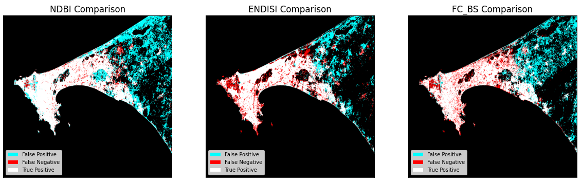 Comparisons between three urban indices, NDBI, ENDISI, and Fractional Cover (bare soil) and the Global Human Settlements layer for the year 2014.